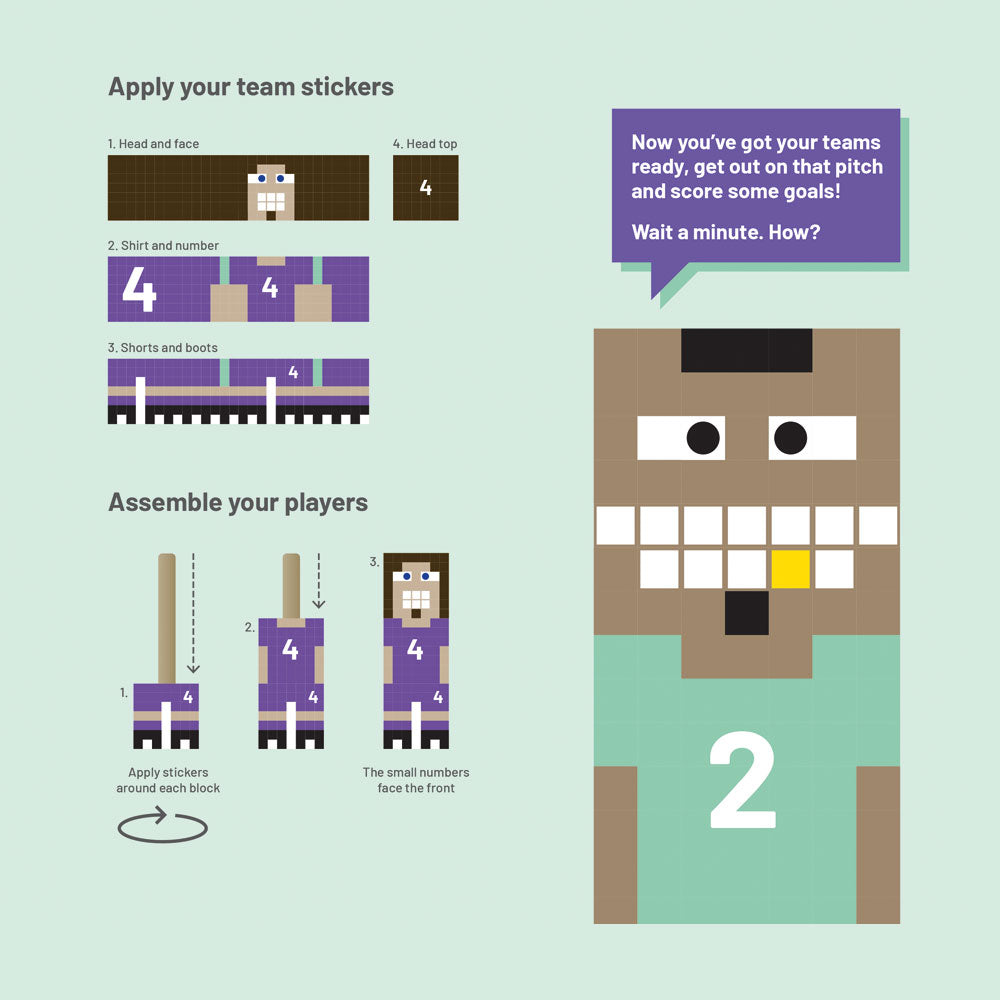 Build your players out of wooden blocks, customise them, and then start playing! The rules are super-simple, the action is non-stop, and you can even use skills to get past your opponents!