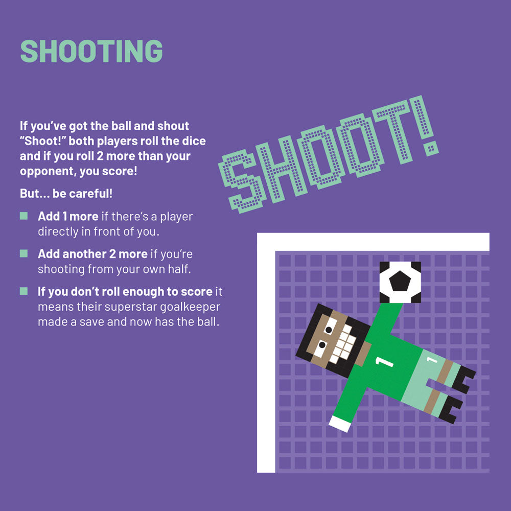 Simple dice modifiers keep the game exciting, even for slightly older youngsters, as does our custom skills dice, where they learn to balance risk and reward (whilst attempting a nutmeg, step-over, or rainbow flick!)